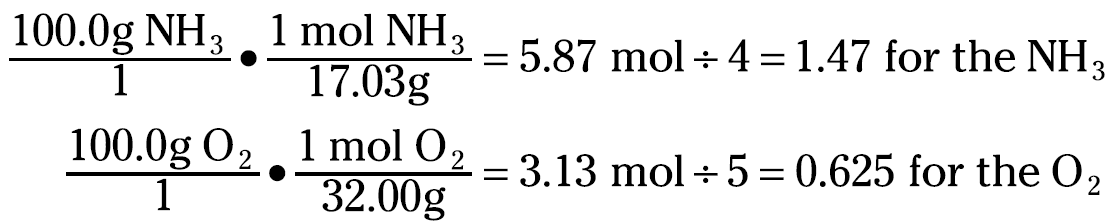 Suppose that you start out with 100.0 grams each of both ammonia and oxygen, and you want to know how many grams of NO (nitrogen monoxide, sometimes called nitric oxide) you can produce. You must determine the limiting reactant and base your stoichiometric calculations on it.