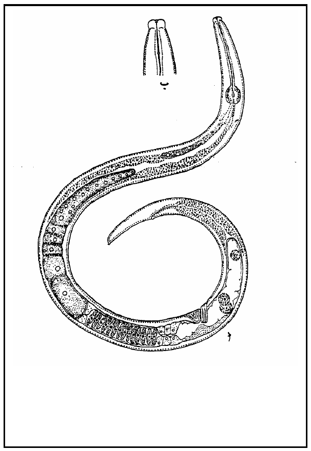 يبلغ طول الجسم في المتوسط حوالي ۱ مم بقطر حوالي ۲۰ ميكرونا. كما يتميز المريء بضخامة البصلة الوسطى، واستطالة الغدد القاعدية التي تتداخل مع الأمعاء لمسافة طويلة.