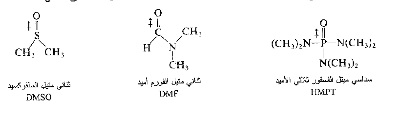 هذه المذيبات اللابروتونية عالية القطبية، ولها عزوم ثنائيات اقطاب اكبر عدة مرات من عزم ثنائي قطب الماء. وكما تشير اصيغ فإن القطب السالب في كل من امثلتنا يقع عند ذرة الاكسجين التي تبرز إلى خارج الجزيء (انظر الشكل 1.1). تذوب الكاتيونات بقوة وذلك عبر الاشفاع الالكترونية غير المشترك بها والموجودة عند ذرات المشحونة سلباً والمكشوفة تماماً.