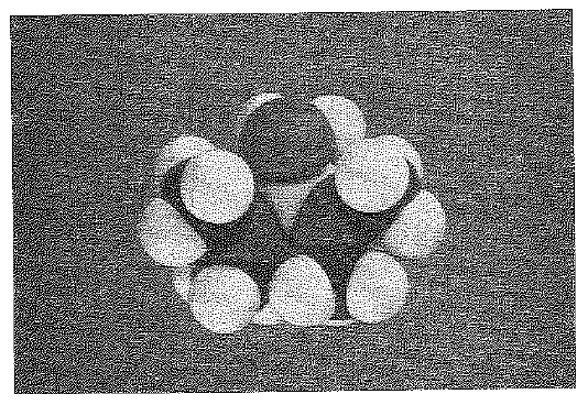 الشكل 1.1 : مذيب لابروتوني قطبي: وسداسي متيل فسفورو ثلثي الاميد (HMPT). يظهر الجزيء بقطبه السالب على ذرة الاكسجين (في قمة الشكل) المتجه إلى الاعلى، بينما يكون القطب الموجب عند ذرة الفسفور (التي تحتها مباشرة) المتجه إلى الاسفل. وكما نرى فإن الاكسجين يبرز خارج الجزيء ويكون مكشوفاً وسهل المنال، وهو يستطيع عبر شحنته الموجبة محجوبة عن الخارج بزمر كبيرة الحجم، وهو ينجذب انجذاباً ضعيفاً نحو الانيونات.