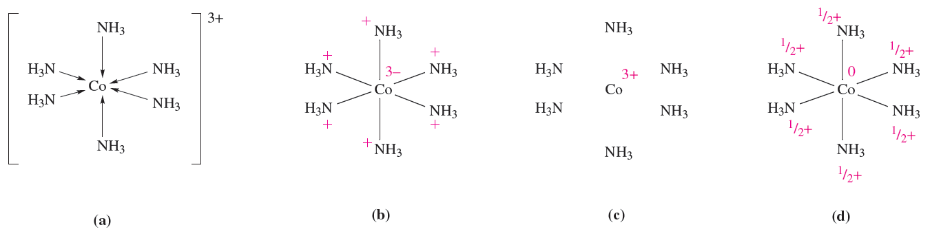 Fig. 1.1 The complex cation [Co(NH3)6]3+: (a) a conventional diagram showing the donation of lone pairs of electrons from ligands to metal ion; (b) the charge distribution that results from a 100% covalent model of the bonding; (c) the charge distribution that results from a 100% ionic model of the bonding; and (d) the approximate charge distribution that results from applying the electroneutrality principle.
