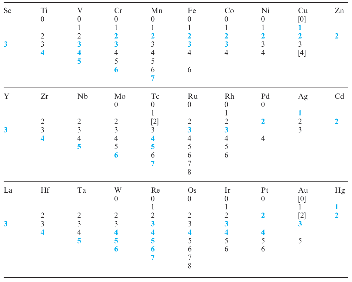 Table 1.1 Oxidation states of the d-block metals; the most stable states are marked in blue. Tabulation of zero oxidation states refers to their appearance in compounds of the metal. In organometallic compounds, oxidation states of less than zero are encountered. An oxidation state enclosed in [ ] is rare.