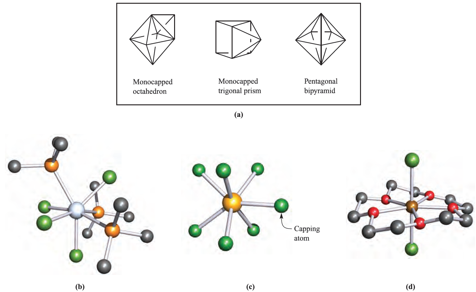 Fig. 1.1 (a) The coordination spheres defined by the donor atoms in idealized 7-coordinate structures. Examples of