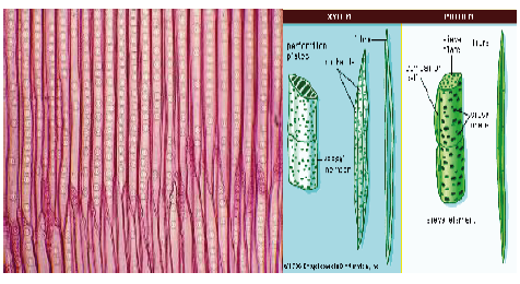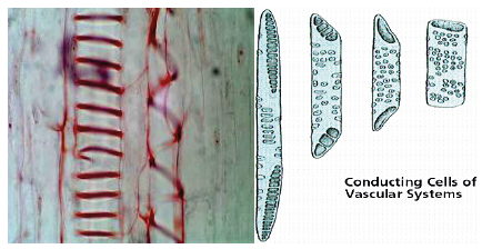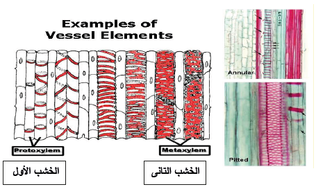 1- الأوعية الخشبية : وتعرف أيضاً باسم القصيبات ويتكون الوعاء الخشبي من خلايا متراصة طولياً فوق بعضها لمسافات مختلفة وخلايا الأوعية الخشبية ميتة ذاتجدر مغلظة تغلظاً ثانوياً ملحنة ونهايتها مثقبة وتحتوي جدرها على نقر بسيط أو مضغوفة أو نصف مضغوفة . وتتصل الأوعية فوق بعضها عن طريق النهايات المعروفة باسم صفائح التثقيب . ويأخذ ترسيب مادة اللجنين على جدار الأوعية أشكالاً مختلفة ليكون أنواع التغليظ الآتية :