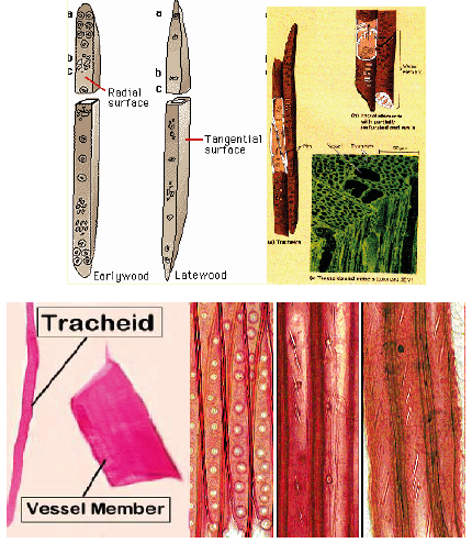 2- القصيبات : وتتكون من خلايا ميتهذات شكل مستطيل وأطراف دقيقة وجدر ملجنة وهي تشبه الأوعية في كل صفاتها التشريحية فيما عدا أن القصيبة منشؤها خلية كمبيومية واحدة وليست عدة خلايا كما في الوعاء الخشبي كما أن اتصال القصيبات بعضها ببعض يكون عن طريق النقر وليست عن طريق صفيحة التثقيب كما في حالة الأوعية . كما أن القصيبات أضيق من الأوعية . وتنتشر القصيبات في خشب نباتات عاريات البذور والتريديات .