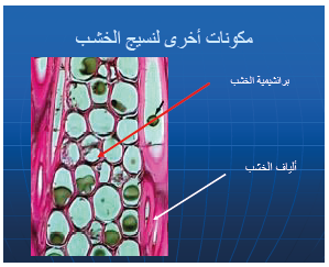 3- ألياف الخشب : وتتكون من خلايا ميتة مدببة الأطراف وذات جدر سميكة ملجنة ولذا فإن وظيفتها دعامية ، ولأنها توجد بين عناصر الخشب سميت بألياف الخشب .