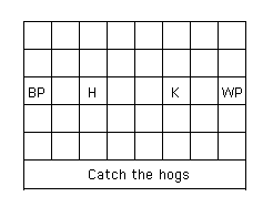 He then goes on to explain the rules of the game. Player one moves first and moves both Hendrick (H) and Katrun (K) one square each in any direction, but not diagonally. Player two then moves the hogs (BP and WP) each one square, again not diagonally. Try the game and see if Hendrick and Katrun can catch the hogs!