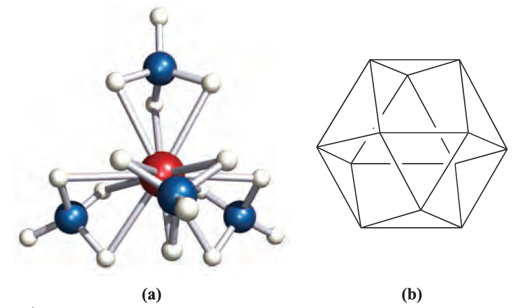Fig. 1.1 (a) The structure of [Hf(BH4)4] determined by neutron diffraction at low temperature [R.W. Broach et al. (1983) Inorg. Chem., vol. 22, p. 1081]. Colour code: Hf, red; B, blue; H, white. (b) The 12-vertex cubeoctahedral coordination sphere of the Hf(IV) centre in [Hf(BH4)4].