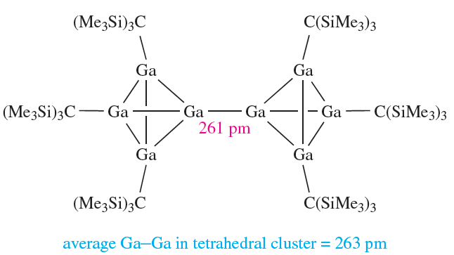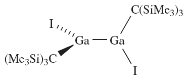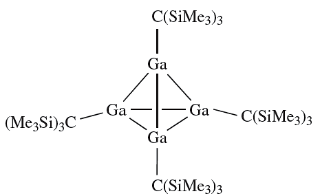 In equation 12.47, we illustrated the use of the metastable GaBr as a precursor to multinuclear Ga-containing species. Gallium(I) bromide has also been used as a precursor to a number of organogallium clusters. For example, one of the products of the reaction of GaBr with (Me3Si)3CLi in toluene at 195K is 1.5.