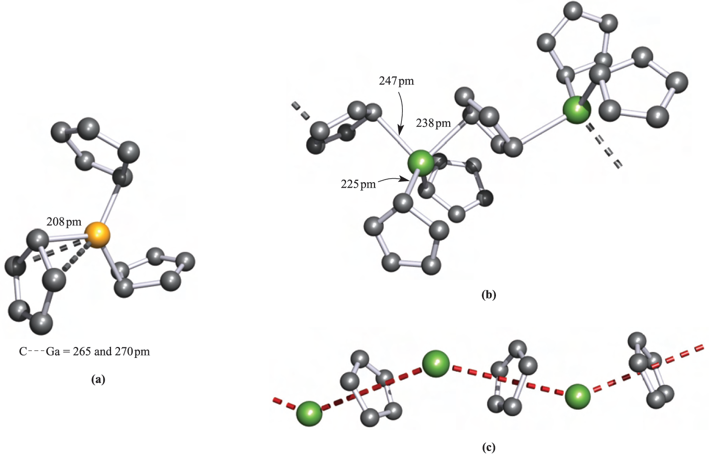 Fig. 1.1 The solid state structures (X-ray diffraction) of (a) monomeric )η1-Cp)3Ga [O.T. Beachley et al. (1985) Organometallics, vol. 4, p. 751], (b) polymeric Cp3In [F.W.B. Einstein et al. (1972) Inorg. Chem., vol. 11, p. 2832] and (c) polymeric CpIn [O.T. Beachley et al. (1988) Organometallics, vol. 7, p. 1051]; the zig-zag chain is emphasized by the red hashed line. Hydrogen atoms are omitted for clarity; colour code: Ga, yellow; In, green; C, grey.