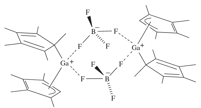InCl3, but is structurally different from Cp3Ga; the solid contains polymeric chains in which each In atom is distorted tetrahedral (Figure 1.1b). The reaction of (η5-C5Me5)3Ga with HBF4 results in the formation of [(C5Me5)2Ga]+[BF4]-. In solution, the C5Me5 groups are fluxional down to 203 K, but in the solid state the complex is a dimer (1.6) containing [(η1-C5Me5)(η3- C5Me5)Ga]+ ions. The structure of [(C5Me5)2Ga]+ contrasts with that of [(C5Me5)2Al]+, in which the C5-rings are coparallel.