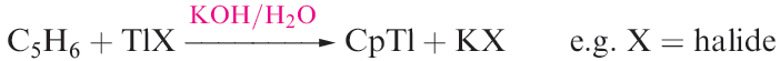We saw earlier that gallium(I) halides can be used to synthesize ArGa compounds. Similarly, metastable solutions of GaCl have been used to prepare (C5Me5)Ga by reactions with (C5Me5)Li or (C5Me5)2Mg. An alternative route is the reductive dehalogenation of (C5Me5)GaI2 using potassium with ultrasonic activation. In the gas phase and in solution, (C5Me5)Ga is monomeric, but in the solid state, hexamers are present. On moving down group 13, the number of M(I) cyclopentadienyl derivatives increases, with a wide range being known for Tl(I). The condensation of In vapour (at 77 K) onto C5H6 gives CpIn, and CpTl is readily prepared by reaction 1.8.
