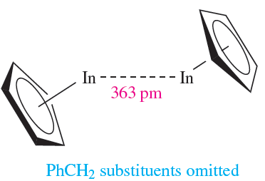 Both CpIn and CpTl are monomeric in the gas phase, but in the solid, they possess the polymeric chain structure shown in Figure 1.1c. The cyclopentadienyl derivatives(C5R5(M (M = In, Tl) are structurally diverse in the solid state, e.g. for R =PhCH2 and M = In or Tl, ‘quasi-dimers’ 1.7 are present (there may or may not be a meaningful metal– metal interaction), and (η5-C5Me5(In forms hexameric clusters.