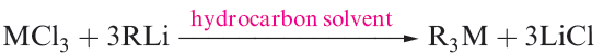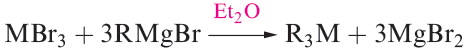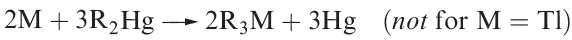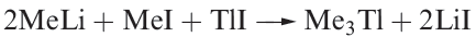 Gallium, indium and thallium trialkyls, R3M, can be made by use of Grignard reagents (reaction 1.2), RLi (equation 1.3) or R2Hg (equation 1.4), although a variation in strategy is usually needed to prepare triorganothallium derivatives (e.g. reaction 1.5) since R2TlX is favoured in reactions 1.2 or 1.3. The Grignard route is valuable for the synthesis of triaryl derivatives. A disadvantage of the Grignard route is that R3M.OEt2 may be the isolated product.