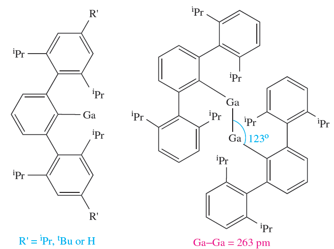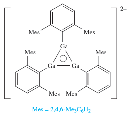 The 2,6-dimesitylphenyl substituent is also extremely sterically demanding, and reduction of (2,6-Mes2C6H3)GaCl2 with Na yields Na2[)2,6-Mes2C6H3(3Ga3]; the [(2,6- Mes2C6H3)3Ga3]2- anion possesses the cyclic structure (1.4) and is a 2π-electron aromatic system.