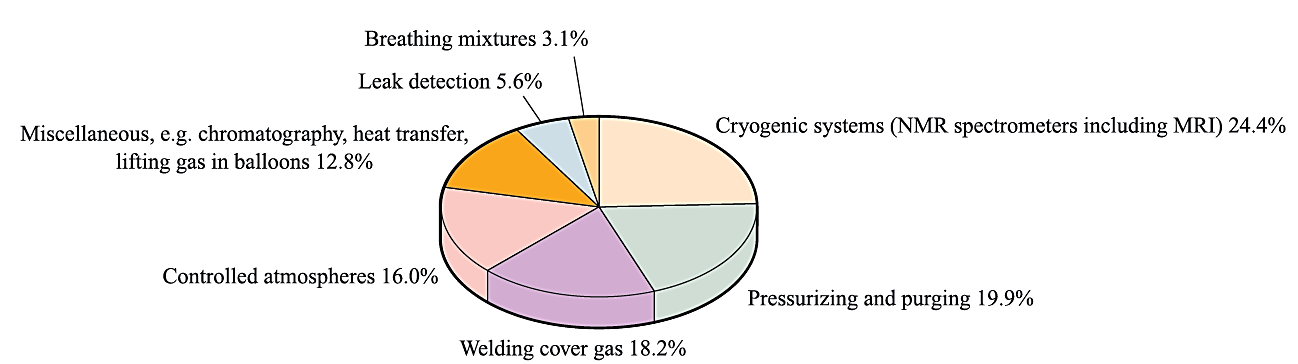 Fig. 1.1 Uses of helium in the US in 2001. The total consumption of ‘grade A’ helium in the US in 2001 was 83 × 106 m3. [Data: US Geological Survey.]