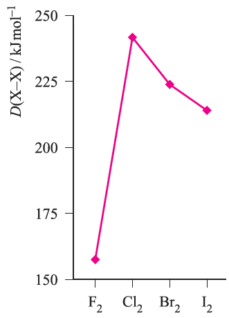 The corresponding Br- and Cl-containing species are less stable, though they are probably involved in aromatic bromination and chlorination reactions in aqueous media. The electron affinity of F is out of line with the trend observed for the later halogens (Table 1.1). Addition of an electron to the small F atom is accompanied by greater electron–electron repulsion than is the case for Cl, Br and I, and this probably explains why the process is less exothermic than might be expected on chemical grounds. As we consider the chemistry of the halogens, it will be clear that there is an increasing trend towards higher oxidation states down the group; this is well exemplified among the interhalogen compounds.