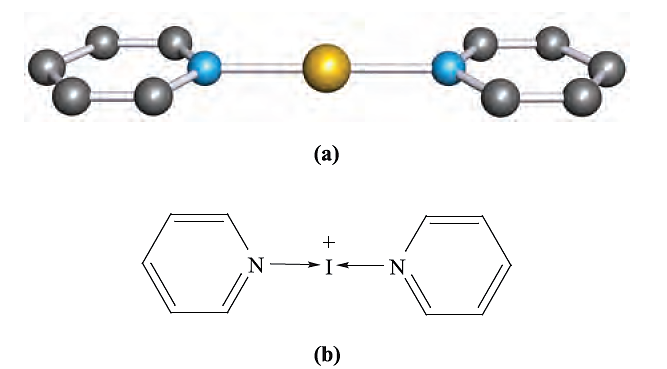 Fig. 1.2 (a) The structure of [I(py)2] + (determined by X-ray crystallography) from the salt [I(py)2][I3].2I2 [O. Hassel et al. (1961) Acta Chem. Scand., vol. 15, p. 407]; (b) A representation of the bonding in the cation. Colour code: I, gold; N, blue; C, grey.