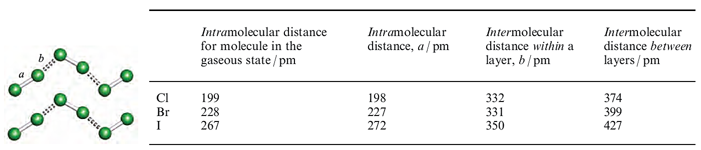 Dibromine is a dark orange, volatile liquid (the only liquid non-metal at 298 K) but is often used as the aqueous solution ‘bromine water’. Skin contact with liquid Br2 results in burns, and Br2 vapour has an unpleasant smell and causes eye and respiratory irritation. At 298 K, I2 forms dark purple crystals which sublime readily at 1 bar pressure into a purple vapour. In the crystalline state, Cl2, Br2 or I2 molecules are arranged in layers as represented in Figure 1.1. The molecules Cl2 and Br2 have intramolecular distances which are the same as in the vapour (compare these distances with rcov, Table 16.1). Intermolecular distances for Cl2 and Br2 are also listed in Figure 1.1; the distances within a layer are shorter than 2rv (Table 16.1), suggesting some degree of interaction between the X2 molecules. The shortest intermolecular X…..X distance between layers is significantly longer. In solid I2, the intramolecular I_I bond distance is longer than in a gaseous molecule, and the lowering of the bond order (i.e. decrease in intramolecular bonding) is offset by a degree of intermolecular bonding within each layer (Figure 1.1).