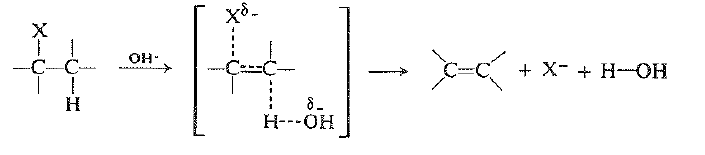 لندرس الحالة الانتقالية للتفاعل E2. تنكسر جزئياً روابط الهيدروجين والزمرة المغادرة، وتتشكل جزئياً الرابطة المزدوجة . وهكذا تكتسب الحالة الانتقالية مقداراً كبيراً من خاصية الالكن.
