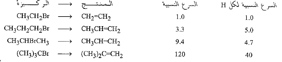 لا يعين استقرار الالكن فقط توجيه نزع هاليد الهيدروجين بل هو ايضاً مهماً في تعيين فعاليةهاليد الالكيل تجاه الحذف وما هو موضح أدناه ، مثلاً، في التفاعل مع ابتوكسيد الصوديوم في الايتانول وعند الدرجة 55 ْ س نرى انه حتى بعد الأخذ بالحسبان عدد معين من الهيدروجينات B- ان السرعة النسبية لكل هيدروجين تزداد عندما يصبح الالكن اكثر استبدالاً.