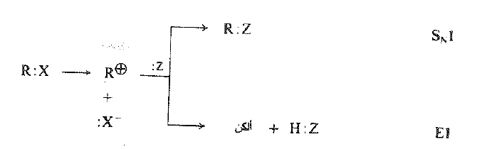 لنعد الآن التنفاس بين التفاعلات الاحادية – الجزيء SN1 و E1 إن كليهما كما رأينا ، يملك نفس الخطوة الأولى التي هي تحلل لا متجانس لتكوين الكربوكاتيون. وفي الخطوة الثانية يتفرع المسار : حيث يقود أحد الفرعين إلى الاستبدال والآخر إلى الحذف.