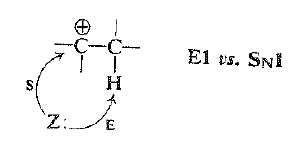 تتعين نسبة المنتجات النهائية الحاصلة – مقدار منتجات الاستبدال ومقدار الالكنات – من السرعات النسبية لهذه الخطوات الثانية البديلة. إن سرعة فقدان الكربوكاتيون للبروتون كما استنتجنا سابقاً (الفقرة 23.8) يعتمد على استقرار الالكن المتشكل وعلى مقدار تفرع الالكنات البسيطة. التسلسل 1 ْ ،< 2 ْ ،< 3 ونتوقع ان تتبع سرعة التفاعل الاستبدال – الاتحاد مع النوكليوفيل – تسلسلاً معاكساً 1 ْ ،> 2 ْ ،> 3 ويكون الكربوكاتيون الأقل استقراراً هو الاقصر حياة في الحقيقة. رأينا في الفقرة 9.7 ان التحليل اللامتجانس حتى للركائز الثانوية، يتضمن بصورة عامة مساعدة نوكليوفيلية من المذيب، قام الكاتيون المتشكل بتعليق جزيء المذيب إلى ظهره ، وهكذا يكون الاستبدال النوكليوفيلي قد بدأ إلى حد ما.