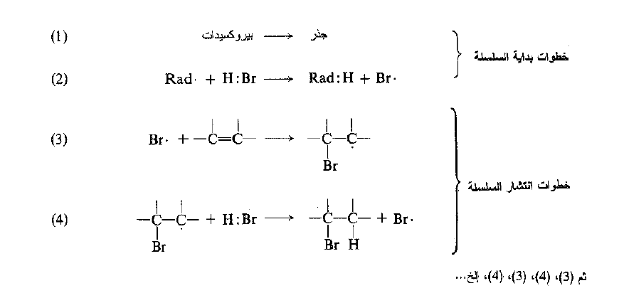 يشبه هذا الجذر الحر، الجذر الحر المتولد في البدء من البيروكسيد حيث يجرد هيدروجيناً من بروميد الهيدروجين (الخطوة 4) . تتم الإضافة الآن، وتولد ذرة بروم جديدة لكي تحقق استمرار السلسلة . وكما في هلجنة الالكانات يحدث في كثير من الأحيان اتحاد جسيم فعال مع آخر أو يستولي عليه جدار وعاء التفاعل ، فتتوقف عندئذ السلسلة عن النمو.