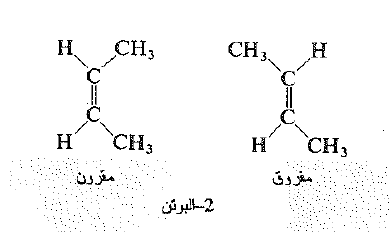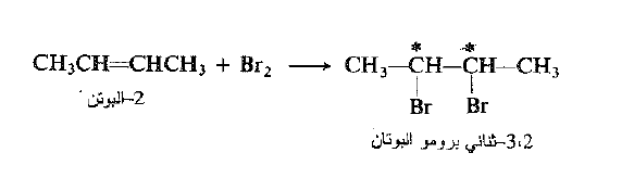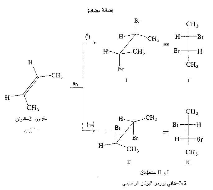 إذا بدأنا من مقرون -2- البيوتين فأي المنتجات المتماكبة فراغياً يمكن ان نحصل عليها؟ هل نحصل على مزيج منها جميعاً؟ كلا. يؤدي الالكن المقرون – إلى 2 ، 3 ثنائي برومو البيوتان الرأسيمين فقط اي مزيج من I و II، ولا نحصل على شيء من المركب ميزو