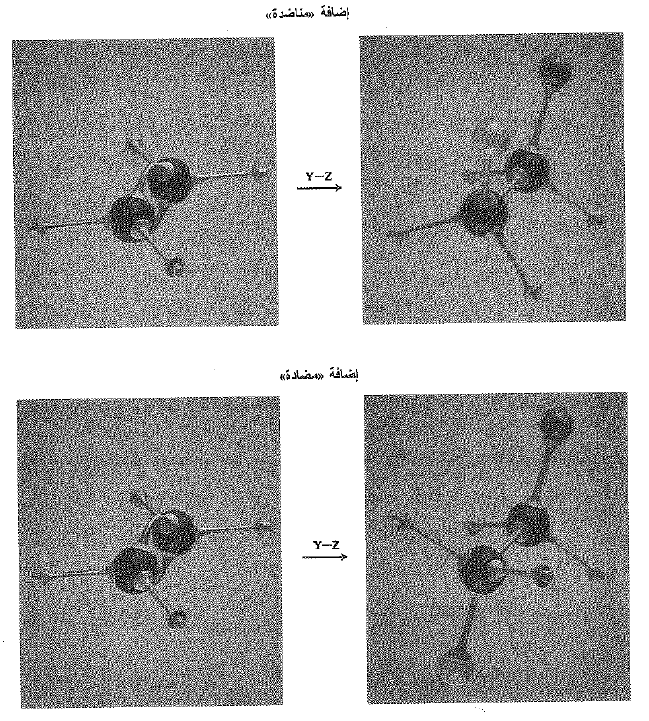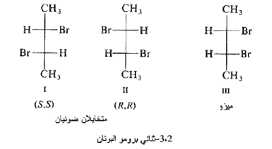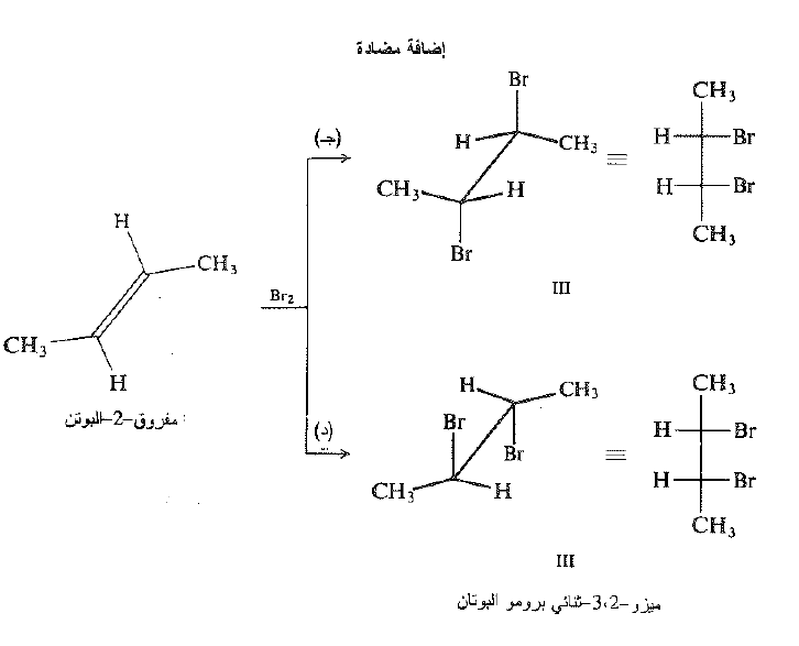 لنبدأ بمفروق -2- البيوتين، نستطيع ، ثانية، ربط ذرتي البروم إلى جهتين متعاكستين من الرابطة المزدوجة بأسلوبين مختلفين: كما في (جـ) و (د) ومهما يكن الأسلوب الذي نختاره ، فإننا نحصل على III ، الذي تميزه على انه ميزو ثنائي البروميد.