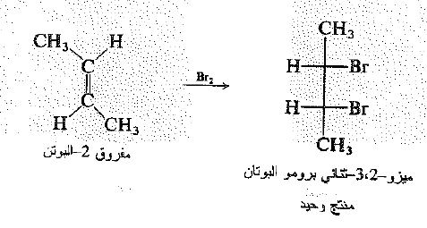 لنبدأ بالكيمياء الفراغية للإضافة ، مستخدمين مثالاً على ذلك تفاعلاً مألوفاً هو إضافة الهالوجينات إلى الالكنات سندرس في الفقرات التي تليها. ما تخبرنا إياه هذه الوقائع حول الآلية. تؤدي إضافة البروم إلى -2 البيوتين ، غلى 2 ، -3، ثنائي برومو البيوتان.