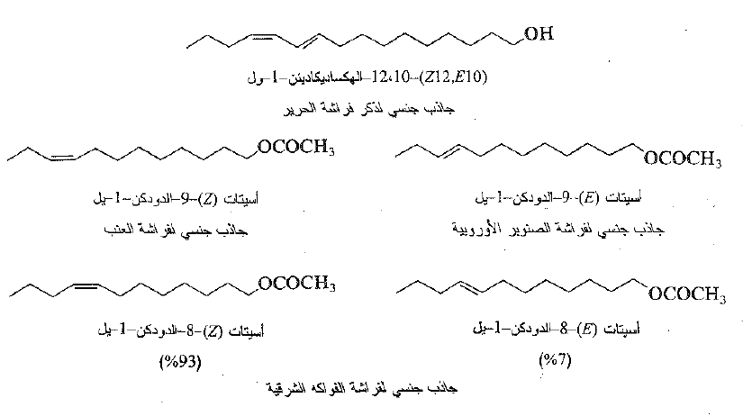 يوجد ، على سبيل المثال، أربعة مماكبات هندسية لمركب 10 ، 12 – الهكساديكاديئن -1- اول واحد منها ، فقط وهو المماكب (Z12,E10) يكون التجاذب الجنسي الذي تصنعه أنثى فراشة الحرير – وهو جاذب للذكر اكثر بملايين المرات من اي من المماكبات الاخرى، ويجتذب ذكر فراش العليق بوساطة اسيتات -9-(Z) الدودكن -1- يل، ويجتذب ذكر فراشة الصنوبر الاوروبي بوساطة المماكب (E) للمركب نفسه ويلغى هذا التجاذب كلياً، بوجود ، 3% فقط من المماكب (Z). يؤدي تحريك الرابطة المزدوجة عبر موقع واحد، يعطي اسيتات -8-(Z) الدودكن -1- يل الذي هو الجاذب الجنسي لفراشة الثمار الشرقية ولكن بوجود 7% فقط من المماكب (E) ، ويكون المماكب (Z) النقي، غير فعال البتة. (إن الحاجة إلى مزيج معين بدقة من المماكبات الفراغية، كثيرة الشيوع).