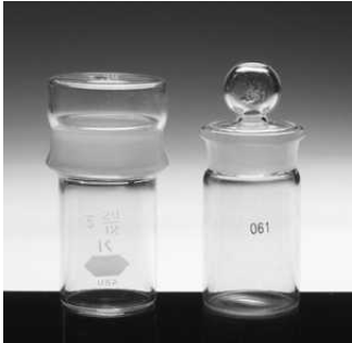 Weighing bottles are convenient for drying and storing solids. Two common varieties of these handy tools are shown in Figure 1.1. The ground-glass portion of the cap-style bottle shown on the left is on the outside and does not come into contact with the contents.