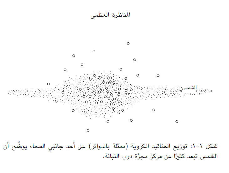 كان مفتاح عملية المسح التي أجراها شابلي لمجرَّة درب التبانة هو أنه كان قادرًا على استخدام النجوم المتغيِّرة من أجل قياس المسافات إلى المنظومات النجمية المعروفة باسم "العناقيد الكروية". وهذه العناقيد الكروية — كما يوحي اسمها — منظومات نجمية كروية الشكل، وقد تحتوي هذه العناقيد على مئات الآلاف من النجوم المنفردة، وفي قلب كل عنقود قد نجد ما يصل إلى ألف نجم محتشدة داخل فرسخ فلكي مكعب واحد، وهو ما يختلف بشدة عن الحال داخل المنطقة التي نسكنها من المجرَّة؛ حيث لا يوجد أي نجم قريب في نطاق فرسخ فلكي كامل من الشمس. تُرى العناقيد الكروية أعلى سطح مجرَّة درب التبانة وأسفله، وعن طريق قياس المسافات إليها، وجد شابلي أنها موزَّعة في حيِّز كروي من الفضاء مركزه نقطة تقع في اتجاه كوكبة الرامي القوس، لكنها تبعد آلاف الفراسخ الفلكية عنَّا؛ في منتصف حزمة الضوء المعروفة باسم الطريق اللبني أو درب التبانة. النتيجة المستخلصة هي أن هذه النقطة تمثِّل مركز مجرَّة درب التبانة، وأن مجموعتنا الشمسية تقع قرب حافة المجرَّة. وبحلول عام 1920 ، كان شابلي قد توصل إلى تقدير يقضي بأن مجرة درب التبانة يصل قطرها إلى نحو 300 ألف سنة ضوئية(نحو 100 كيلو فرسخ فلكي)، وان الشمس تبعد عن مركز المجرة بنحو 60 ألف سنة ضوئية (نحو 20 كيلو فرسخاً فلكياً)، وقد عبر هن هذا في اجتماع واشنطن بقوله :