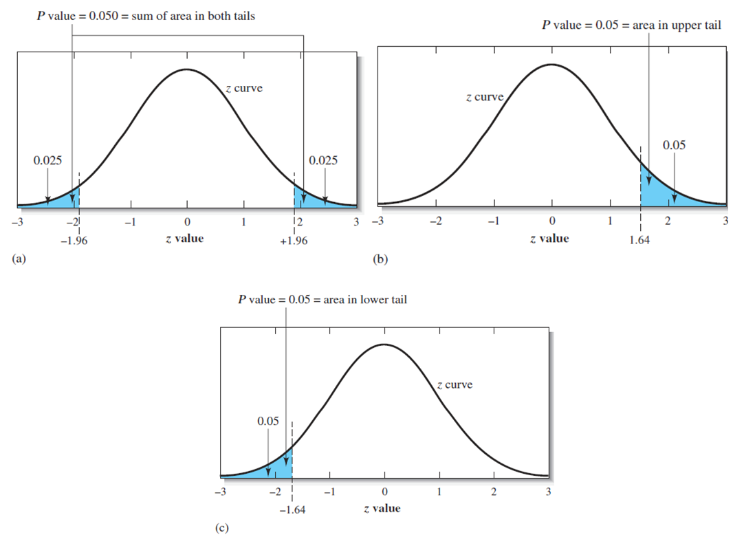 Figure 7-2 Rejection regions for the 95% confidence level. (a) Two-tailed test for Ha: μ ≠ μ0. Note the critical value of z is 1.96 . (b) One-tailed test for Ha: m > m0. The critical value of z is 1.64 so that 95% of the area is to the left of zcrit and 5% of the area is to the right. (c) One-tailed test for Ha: μ < μ0. The critical value is again 1.64 so that 5% of the area lies to the left of -zcrit.