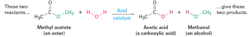occur when two reactants exchange parts to give two new products. An example is the reaction of an ester such as methyl acetate with water to yield a carboxylic acid plus an alcohol. Similar reactions occur in many biological pathways, including the metabolism of dietary fats.