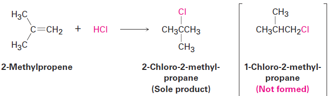 Look carefully at the electrophilic addition reactions shown in the previous section. In each case, an unsymmetrically substituted alkene gives a single addition product rather than the mixture that might be expected. For example, 2-methylpropene might react with HCl to give both 2-chloro-2-methylpropane and 1-chloro-2-methylpropane, but it doesn’t. It gives only 2-chloro-2-methylpropane as the sole product. Similarly, it’s invariably the case in biological alkene addition reactions that only a single product is formed. We say that such reactions are regiospecific (ree-jee-oh-specific) when only one of two possible orientations of an addition occurs.