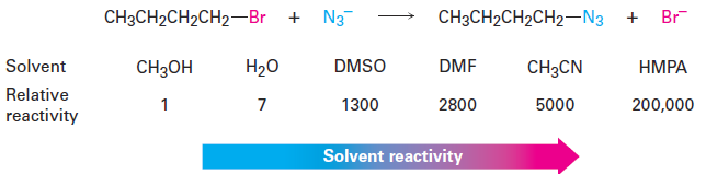 In contrast with protic solvents—which decrease the rates of SN2 reactions by lowering the ground-state energy of the nucleophile—polar aprotic solvents increase the rates of SN2 reactions by raising the ground-state energy of the nucleophile. Acetonitrile (CH3CN), dimethylformamide [(CH3)2NCHO, abbreviated DMF-, dimethyl sulfoxide [(CH3)2SO, abbreviated DMSO-, and hexamethylphosphoramide {[(CH3)2N-3PO, abbreviated HMPA} are particularly useful. These solvents can dissolve many salts because of their high polarity, but they tend to solvate metal cations rather than nucleophilic anions. As a result, the bare, unsolvated anions have a greater nucleophilicity and SN2 reactions take place at correspondingly increased rates. For instance, a rate increase of 200,000 has been observed on changing from methanol to HMPA for the reaction of azide ion with 1-bromobutane.
