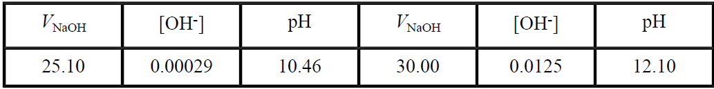 and the pH is computed as pH = 14.00 - log[OH-]. Continuing the table for two more points:
