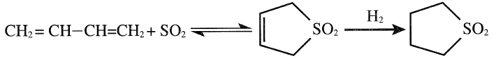 Optimum temperature for highest sulfolene yield is approximately 75°C. At approximately 125°C, sulfolene decomposes to butadiene and SO2. This simple method could be used to separate butadiene from a mixture of C4 olefins because the olefins do not react with SO2. Sulfolane is a water-soluble biodegradable and highly polar compound valued for its solvent properties. Approximately 20 million pounds of sulfolane are consumed annually in applications that include delignification of wood, polymerization and fiber spinning, and electroplating bathes. It is a solvent for selectively extracting aromatics from reformates and coke oven products.