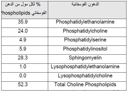 وتكون قيم Reichert Value لحليب الإبل منخفضة حوالي 16.4 . أغلب الدراسات كما موضح في الجدول تشير الى انخفاض الحوامض الدهنية قصيرة السلسلة C12-C 4 ، وارتفاع الأحماض طويلة السلسلة مثل البالمتيك والستياريك لذا تكون الكليسريدات الثلاثية ذات نقطة انصهار ونقطة تبلور عالية ، ومن حيث المحتوى من الحوامض الدهنية الطويلة فهي تكون مشابهة لحليب الجاموس والنعاج . وتكون أقطار حبيبات الدهن كبيرة وتصل من 4.2- 2.9 مايكرون في القطر ولها غلاف أسمك من حبيبات دهون الحيوانات الأخرى ومرتبطة بالبروتينات بشدة ولكن ينقصها Agglutinin الذي يؤدي الى بطء فصل الدهن عند جميع درجات الحرارة ، كل هذه العوامل تصعب من فصل القشطة من الحليب لذا يصعب صناعة الزبد من حليب الإبل ، فضلاً عن ان استخلاص الفيتامينات الذائبة في الدهون مثل فيتامينA يحتاج الى صوبنة ومعاملات قاسية. ونظراً لانخفاض مستوى الدهون في حليب الإبل يلاحظ ان نسبة الدهن تساوي تقريبا" المواد الصلبة الكلية التي تصل الى 31.6 مقارنة مع حليب الجاموس التي تصل الى 41 تقريباً . أما توزيع الدهون الفوسفاتية للحليب فلها نمط خاص كما موضح في الجدول الآتي :