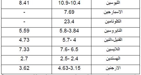 أما محتوى الجزء ألبروتيني للحليب من الحوامض الامينية فهي تقل بتقدم مدة الحلب وبشكل عام يكون كل من الميثايونين والفالين والفنيل-النين والارجنين والليوسين بمستويات أعلى من حليب الأبقار ، والجدول التالي يوضح محتوى الكازينات من الحوامض الامينية مقارنة بحليب الأبقار .