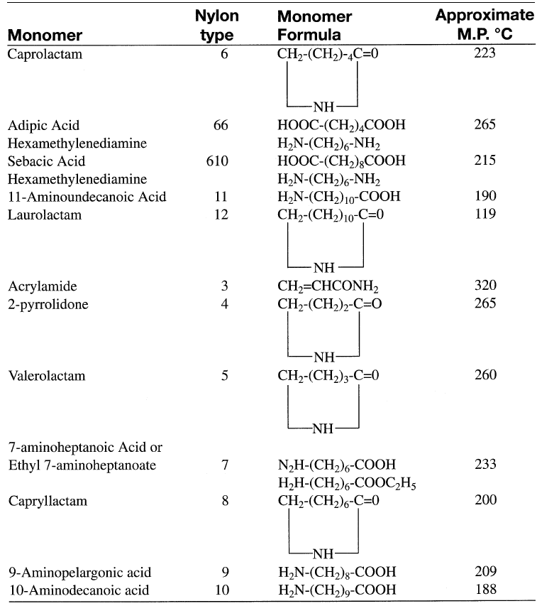 Many other nylons could be produced such as nylon nylon 5, nylon 7, nylon 610, and nylon 612. These have properties generally similar to those nylons described. Table 1.1 shows the monomers used to produce important nylons and their melting points.