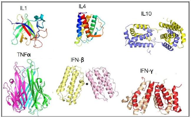 والملاحظ من التراكيب ان بعضها يقتصر تركيبها على صفائح بتا β-sheets كما في TNF-α واللفات Coils والبعض الاخر اقتصرت تراكيبها على وجود حلزونات Heliexes واللفات كما في IFN-γ وبالإضافة إلى ما . ذكر فهناك بعض الوظائف التي تقوم بها أكثر من بروتين من بروتينات السايتوكينات، كما أن البعض منها له أكثر من وظيفة اعتماداً على الخلية التي ترتبط إليها، كما أن السايتوكاين الواحد يمكن أن ينتج من خلايا مختلفة وتحت ظروف مختلفة، بالإضافة إلى ذلك فإن عمل هذه البروتينات يمكن أن يتآزر فيما بينها أو يتضاد.