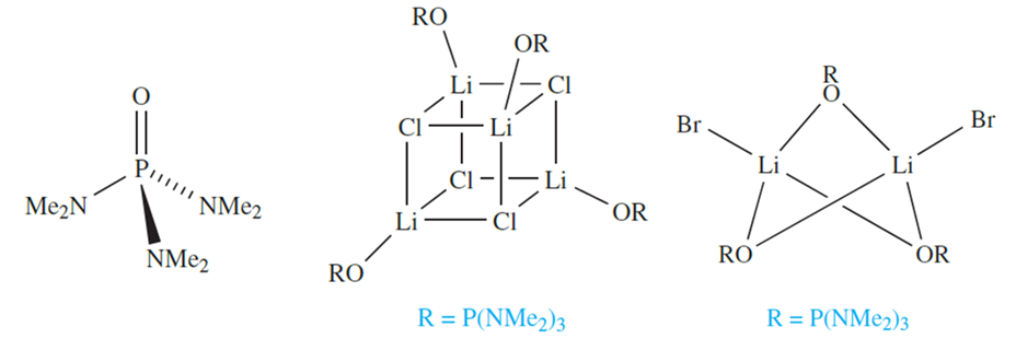 A growing number of complexes (generally air- and moisture- sensitive) involving alkali metal ions with O- or Ndonor ligands and formed in non-aqueous media are now known, although the chemistry of the later group 1 metals is not so widely developed as that of Li. A general method of synthesis is to prepare an alkali metal salt in the presence of a coordinating ligand. For example, in [{LiCl(HMPA)}4], use of the bulky ligand HMPA (hexamethylphosphoramide), 10.5, results in the isolation of a discrete complex rather than an extended LiCl lattice; the complex contains the cubic Li4Cl4 core. Increasing the size of the halogen tends to reduce the nuclearity of the product, e.g. [Li2Br2(HMPA)3]. The bonding in these complexes is of interest can be viewed in terms of a central aggregate of Li+ and Cl- ions, and in general, the bonding should be considered to be predominantly ionic.