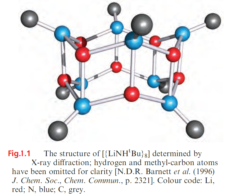 Amidolithium complexes of type RR’NLi (e.g. R and R’ = alkyl, aryl, silyl) exhibit a fascinating structural diversity; as above, bulky amido ligands are essential for complex stabilization. Planar Li2N2-rings are common structural units, and these appear in a variety of laddered structures which may be polymeric or discrete molecular as in [{tBuHNLi}8] (Figure 1.1).