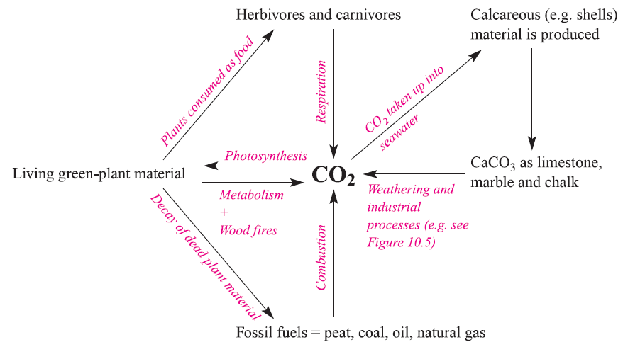 The balance is a delicate one, and the increase in combustion of fossil fuels and decomposition of limestone for cement manufacture in recent years have given rise to fears that a consequent increase in the CO2 content of the atmosphere will lead to an ‘enhanced greenhouse effect’, raising the temperature of the atmosphere. This arises because the sunlight that reaches the Earth’s surface has its maximum energy in the visible region of the spectrum where the atmosphere is transparent. However, the energy maximum of the Earth’s thermal radiation is in the infrared, where CO2 absorbs strongly.
