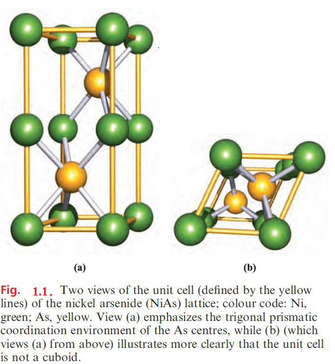 The lattice can be described as a hexagonal close-packed (hcp) array of As atoms with Ni atoms occupying octahedral holes. Although such a description might conjure up the concept of an ionic lattice, the bonding in NiAs is certainly not purely ionic. Figure 1.1 shows a unit cell of NiAs. The placement of the Ni atoms in octahedral holes in the hcp arrangement of As atoms means that the coordination environment of the As centres is trigonal prismatic. Although each Ni atom has six As neighbours at 243 pm, there are two Ni neighbours at a distance of only 252pm (compare rmetal(Ni)=125 pm) and there is almost certainly Ni_Ni bonding running through the structure. This is consistent with the observation that NiAs conducts electricity.