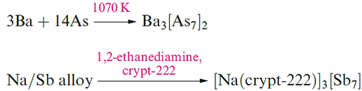 Arsenides and antimonides containing the [As7]3- and [Sb7]3- ions can be prepared by, for example, reactions below. These Zintl ions are structurally related to [P7]3- .