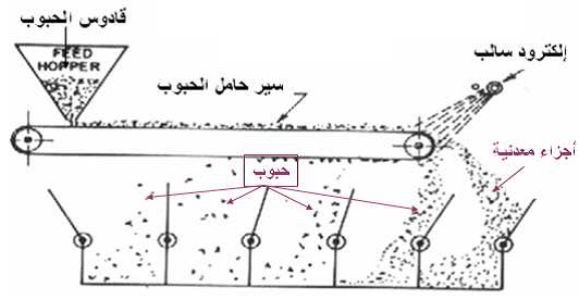 ويتم تنفيذ هذه الطريقة (شكل 1 ) بمرور الحبوب على سير مطاطي مشحون بشحنة موجبة ويوجد بأعلى السير ألكترود مشحون بشحنة سالبة. وأثناء مرور البذور على السير يحدث تجاذب بين الشحنات السالبة للبذور والشحنة الموجبة للسير وعند مرور البذور تحت الألكترود يحدث تجاذب بين الشحنة الموجبة للبذور والشحنة السالبة للألكترود مما يؤدى إلى انفصال الحبوب عن السير وسقوطها فورًا نتيجة لكبر وزنها أما الشوائب فأنها تكون ذات وزن أقل فتظل ملتصقة بالسير وتسقط بعد ذلك. كذلك تستخدم هذه الطريقة في تنظيف أوراق الشاي من الشوائب والأتربة.